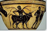 Then, the sacrificer cut some hair from the forehead of the animal with the sacrificial knife and threw it on the fire (aparchesthai), the final step of the preparation. Smaller animals were lifted over the altar and their neck was cut, whereas oxen and bulls were struck on the nape with an ax and then the carotid was cut. At that moment the attendant women would shout in a shrill cry (ololyge). The blood was collected in a lekane, for the altar to be spattered, and first of all the heart and the entrails were removed, to be roasted on the fire and be eaten immediately by the participants. At the same time the animal was carved and skinned. They separated its unedible parts (bones) and placed them on a pile of wood, in a way that symbolically recomposed the animal, in order to be burnt. With the bones small quantities of food (cakes, gruel) were also burnt, whereas wine was spilled on the fire to intensify it. After the completion of all this, the roasting or the boiling of the meat, which was consumed during the sacrificial meal began. In fact, in many cases noone was allowed to take home meat from the sacrifice. |