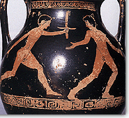 ![]() | After the battle of Plateae the Greek cities received new fire from Delphi. The extinguishing and rekindling form a characteristic, symbolic representation of the process of purification, of a new beginning and of a reaffirmation of common principals. However for the rituals of purification water was more usual. Purity is in fact one of the elements that define the community and purification the way for the "unclean" to be reincorporated in it, or for the miasma to be sent away. Nevertheless, we cannot eliminate the possibility that purification was some primitive form of decontamination, since it was combined at times with sulphur and other times with fumigation or with washing. Of course the greatest miasma of all was human blood, especially, when it was shed in violation sacred bonds (family) and sacred places (temples, altars). In such cases the unclean person was expelled from the city or he was enforced to do special acts of purification. Apollo was par excellance the god of purifications and his priests who were professed in them were called kathartai. The most celebrated of all was Epimenides the Cretan who came to Athens to release it from the Cyloneion agos, (curse) and among the measures that he took then was the banishment of the family of Alcmaeonidae. |