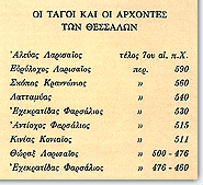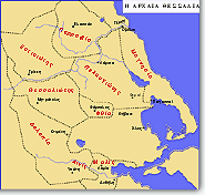 According to Thucydides, the Thessalians occupied the land that bore their name sixty years after the Trojan War. Aleuas I of Larisa, the first tagos of the region, divided it into four parts, the so-called tetrades: Thessaliotis, Pelasgiotis, Histiaeotis, and Phthiotis. Heading the tetrades were families such as the Aleuadae of Larisa; the Scopadae of Crannon; and the Echecratidae of Pharsalus. He also laid down that in time of war each family should provide forty horsemen and eighty peltasts. Initially the tagos was appointed commander of the army in wartime. But in many instance he retained this power for life. The previous inhabitants left the country, and those who remained formed a group called, in the central plain, penestae, or, in Perraebia, Magnesia, and | ![]() |