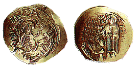 Gold hyperpyron of the emperor Anronikos II Palaiologos (1282-1328). On the obverse, the Virgin on the walls of Constantinople and on the reverse Andronikos II kneeling before Christ Athens, private collection.