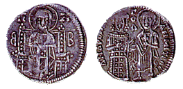 Silver basilikon of Andronikos III Palaiologos (1328-1341). On the obverse Christ enthroned, on the reverse St Demetrios (on the right) standing by the emperor (on the left). Athens, private collection.