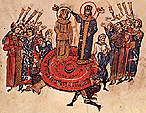 Μικρογραφία από το Χρονικό του Ιωάννη Σκυλίτζη, τέλη 12ου αρχές 13ου αιώνα. Ο Λέων Ε' ο Αρμένιος ανακηρρύσεται συναυτοκράτορας από το Μιχαήλ Α'. Madrid, Biblioteca Nacional, fol. 10v (THURN 5. 67-74) © Biblioteca Nacional, Madrid