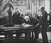 Ο Ελευθέριος Βενιζέλος υπογράφει το ελληνοϊταλικό σύμφωνο. Δεξιά, όρθιος, διακρίνεται ο Ιταλός πρωθυπουργός Μουσολίνι, ενώ αριστερά διακρίνεται ο Δ. Κακλαμάνος. Αθήνα, Φωτογραφικό Αρχείο Ε.Λ.Ι.Α. © Ελληνικό Λογοτεχνικό Ιστορικό Αρχείο |