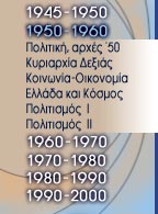 Η περίοδος αυτή εξελίσσεται σε διαφορετικούς χρόνους και βιώνεται πολύτροπα από τους ανθρώπους που βγαίνουν από τις τρικυμίες της δεκαετίας του '40. Από τη μια συντελούνται μεταβολές μεγάλης κλίμακας, όπως η αστικοποίηση, η βιομηχανική ανάπτυξη και η μετανάστευση. Πλάι σ' αυτές αναπτύσσονται αντιδράσεις στο εσωτερικό μιας διχασμένης κοινωνίας που συχνά αρνείται να διαπραγματευτεί με το παρελθόν της και αδυνατεί να εκλογικεύσει τα διλήμματά της (Κυπριακό, πολιτικοί κρατούμενοι).