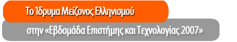 Το Ίδρυμα Μείζονος Ελληνισμού συμμετείχε στο πρόγραμμα «Εβδομάδα Επιστήμης και Τεχνολογίας 2007», από τις 29 Ιουνίου έως τις 5 Ιουλίου 2007 στο Ζάππειο Μέγαρο, όπου παρουσίασε την πολύπλευρη δραστηριότητά του. Το περίπτερο του ΙΜΕ, πάντα εξοπλισμένο πλήρως με ηλεκτρονικούς υπολογιστές, παρουσίασε στους επισκέπτες το τελευταίο έργο του Ιδρύματος, το Πρόγραμμα Γενεαλογίας (http://genealogy.ime.gr/), το οποίο καταγράφει την ελληνική παρουσία σε τόπους εκτός των σημερινών συνόρων της Ελλάδας. |
