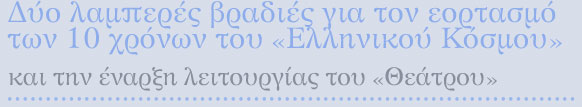 Δύο βραδιές γεμάτες λάμψη και δημιουργία σηματοδότησαν τον εορτασμό των 10 χρόνων του «Ελληνικού Κόσμου» και την έναρξη λειτουργίας του νέου κτηρίου «Θέατρον». Στις 20 και 21 Μαρτίου 2008 η αθηναϊκή κοινωνία συμμετείχε σε δύο εκδηλώσεις-ορόσημο για τα ελληνικά πολιτιστικά δρώμενα. H εκδήλωση της 20ής Μαρτίου σηματοδοτήθηκε από την παρουσία της Α.Ε. του Πρόεδρου της Δημοκρατίας κύριου Κάρολου Παπούλια, ο οποίος πρώτος ανέβηκε στο βήμα του «Θεάτρου» και απηύθυνε χαιρετισμό, υπογραμμίζοντας το ρόλο ανάλογων πρωτοβουλιών για το μέλλον του τόπου μας. Την εκδήλωση της 21ης Μαρτίου τίμησε με την παρουσία του ο Υπουργός Ανάπτυξης κ. Χρήστος Φώλιας, ο οποίος τόνισε τη σημασία ενός τέτοιου έργου για την πορεία του πολιτισμού της χώρας μας.