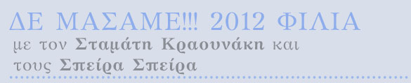 Ο Σταμάτης Κραουνάκης και η Ομάδα Μουσικού Θεάτρου Σπείρα Σπείρα παρουσιάζουν στο Αίθριο του «Ελληνικού Κόσμου» την παράσταση «Δε μασάμε!!! 2012 φιλιά». Πρόκειται για μια θυμωμένη, αστεία, απολαυστική και ταυτόχρονα μουσική ανάσα μέσα στο καλοκαίρι. Διαθέτει τραγούδια, σκετς, χιούμορ, τόλμη και διαμαρτυρία.