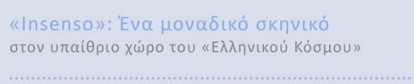 Η παράσταση «Insenso» του Δημήτρη Δημητριάδη -βασισμένη στο ομώνυμο έργο του Λουκίνο Βισκόντι- σε σκηνοθεσία Μιχαήλ Μαρμαρινού, διαδραματιζόταν κατά ένα μέρος στον πίσω χώρο «Ελληνικού Κόσμου». Εκεί, η ομορφιά του τοπίου, το σούρουπο, οι γλάροι, το πιάνο πάνω στο λόφο και οι 21 ερμηνεύτριες διάσπαρτες ανάμεσα στα ξερά κίτρινα χόρτα, απέδωσαν με τον πιο αντιπροσωπευτικό τρόπο την ατμόσφαιρα του έργου χαρίζοντας μοναδικές στιγμές συγκίνησης στους θεατές.