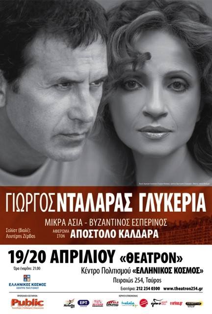 19, 20 & 27.04: ΓΙΩΡΓΟΣ ΝΤΑΛΑΡΑΣ – ΓΛΥΚΕΡΙΑ «ΜΙΚΡΑ ΑΣΙΑ-ΒΥΖΑΝΤΙΝΟΣ ΕΣΠΕΡΙΝΟΣ ΑΦΙΕΡΩΜΑ ΣΤΟΝ ΑΠΟΣΤΟΛΟ ΚΑΛΔΑΡΑ». Οι δύο καλλιτέχνες ενώσαν τις φωνές σε ένα αφιέρωμα στον μεγάλο Έλληνα συνθέτη Απόστολο Καλδάρα στο «ΘΕΑΤΡΟΝ» του Κέντρου Πολιτισμού «Ελληνικός Κόσμος».