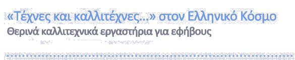 Πρώτη φορά φέτος οι πόρτες του «Ελληνικού Κόσμου» ανοίγουν για να φιλοξενήσουν θερινά δημιουργικά εργαστήρια για εφήβους. Καλλιτέχνες συναντούν ομάδες εφήβων και τους παρακινούν να εκφράσουν τις ιδέες και τη φαντασία τους και να βιώσουν τη χαρά της δημιουργίας ενός καλλιτεχνικού προϊόντος!